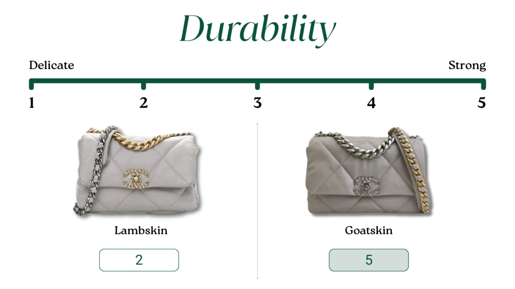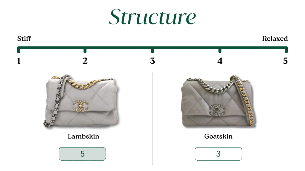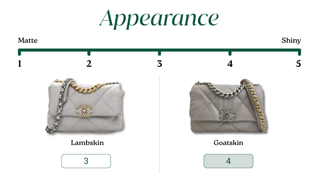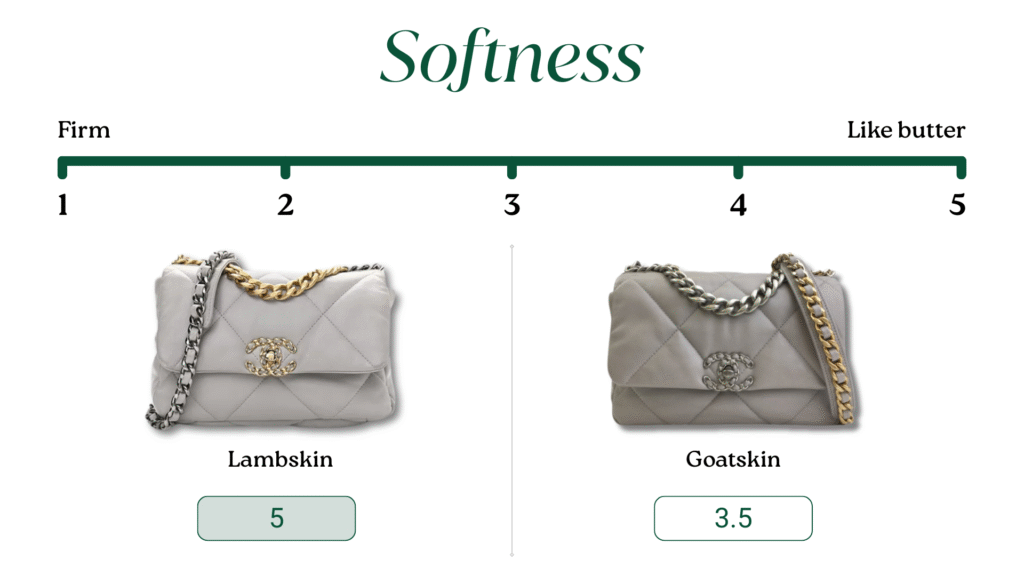 Its texture is pebbled, slightly grainy, and more structured than lambskin.