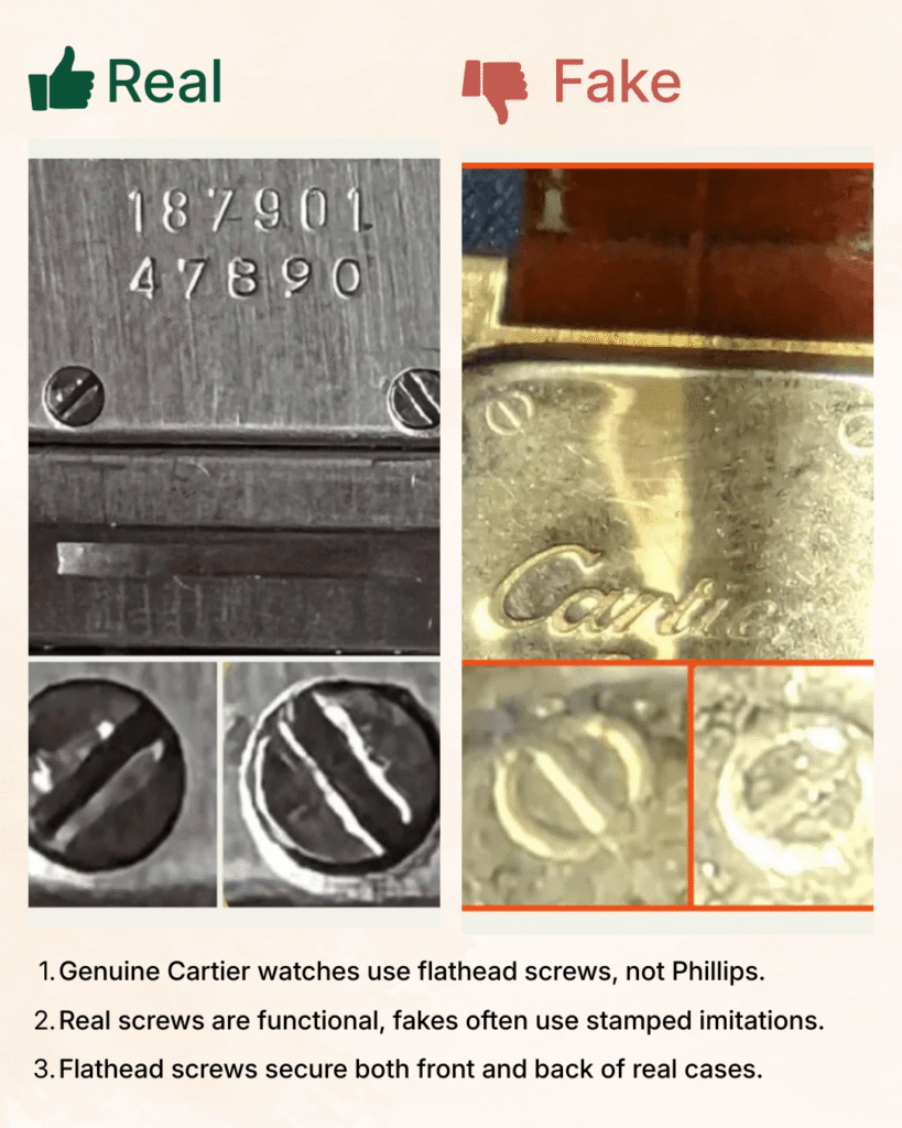 If the screws on the bezel look uneven or like a stamped imitation (like they don’t actually do anything), it’s probably not real.