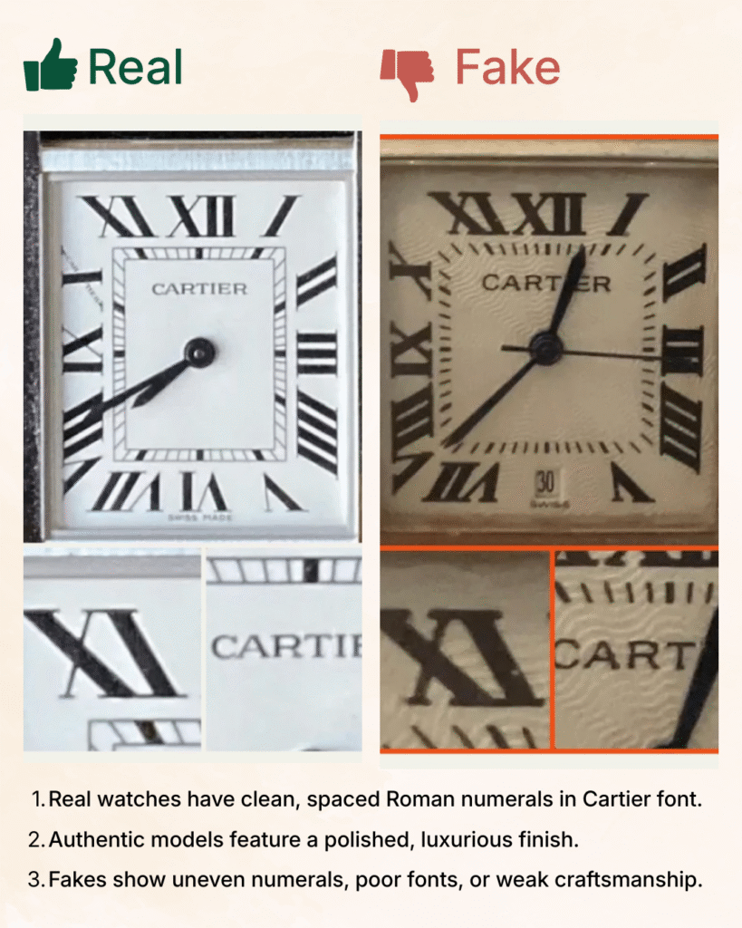 Real Cartier numerals are crisp, clean, and spaced evenly in the classic Cartier font.