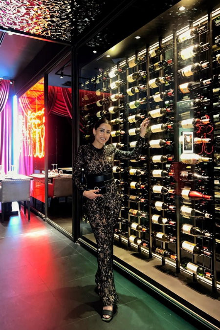A stunner in black lace! The Nadine Merabi Bella Jumpsuit features sequin-dusted floral lace over a nude lining, creating just the right mix of sultry and sleek. Style it with or without the leather corset belt, either way, the silhouette is pure confidence.